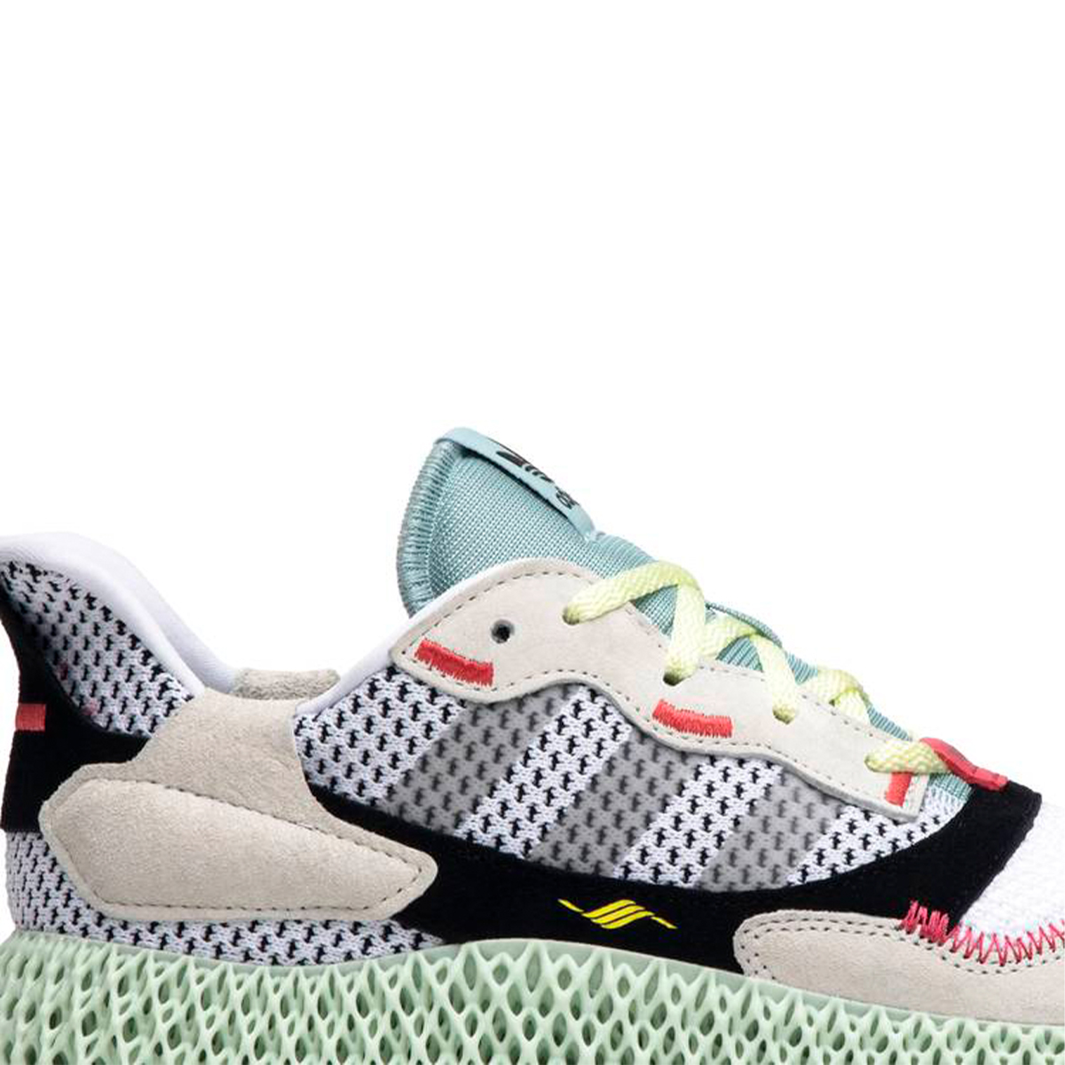 This ZX 4000 Futurecraft 4D sports a white upper with black, grey, and red accents, three grey adidas stripes, green midsole, and a black sole with red accents.