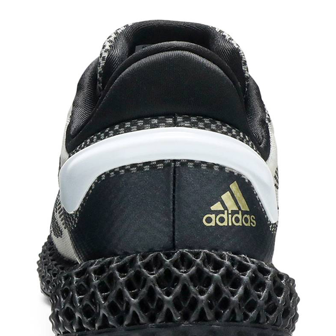“Core Black/Cloud White” features a technical print on its upper, similar to past “Signal Coral” and “Footwear White” makeups. This dotted detail is dressed in black, and sits on top of a gray base layer. Synthetic black overlays, a white heel clip and white Three Stripe branding add layered detailing, with gold foil stamps appearing on heel and tongue alike. Digitally printed 4D midsoles in black complete the look.