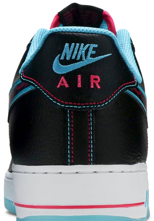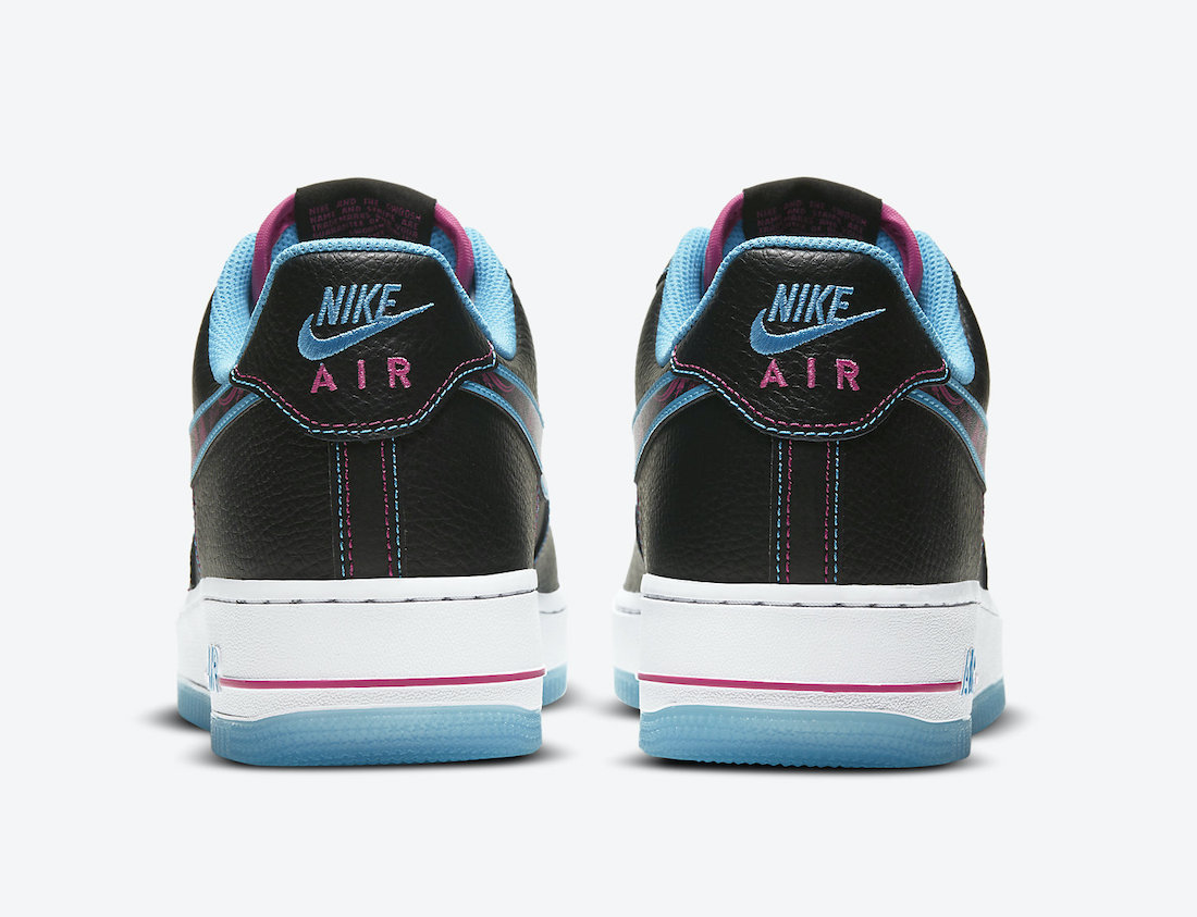 This offering of the Nike Air Force 1 features a Black tumbled leather upper with signature perforations on the toe box and side panels. Blue and Pink stitching and contrasting accents throughout, mesh tongues, and floral graphics on the Swooshes and insoles adds to the “Miami Nights” theme.
