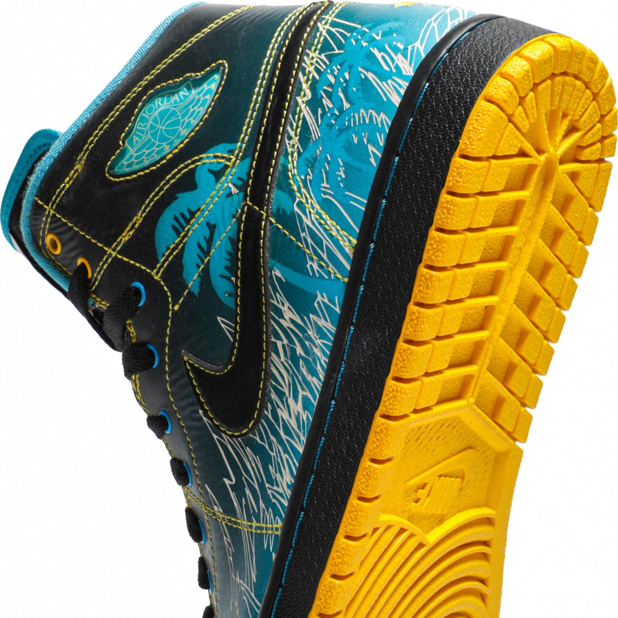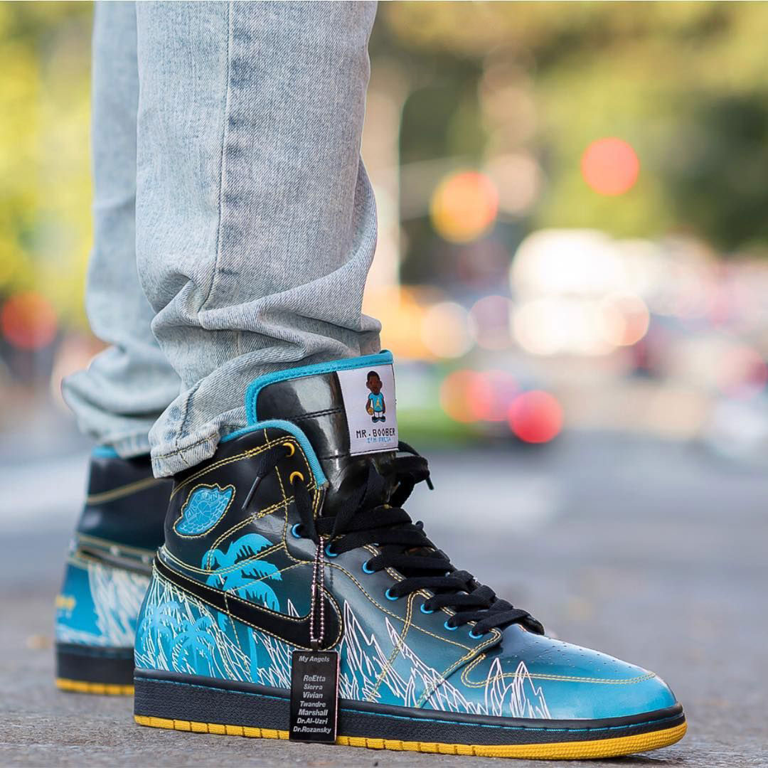 This year, 16-year-old Tony Taylor Jr. aka Mr. Boober, a Nephrotic Syndrome and a kidney transplant survivor, got the chance to design his very own Air Jordan 1 sneaker. This was a dream for Tony, as he is an avid Air Jordan collector. With the help of Jordan designers Jayson Mayden and Estelle Maranan, he was able to put together a work of art that was inspired by his life experiences. The black/blue color scheme represents his success with the battle against kidney disease, while the contrasting yellow and number 15 honor his favorite player, Carmelo Anthony. Below the number 15 is the date he received his kidney transplant and below that are four stars which represent his high school’s mascot, the Generals. The palm trees along the midsole resemble the Bahamas.