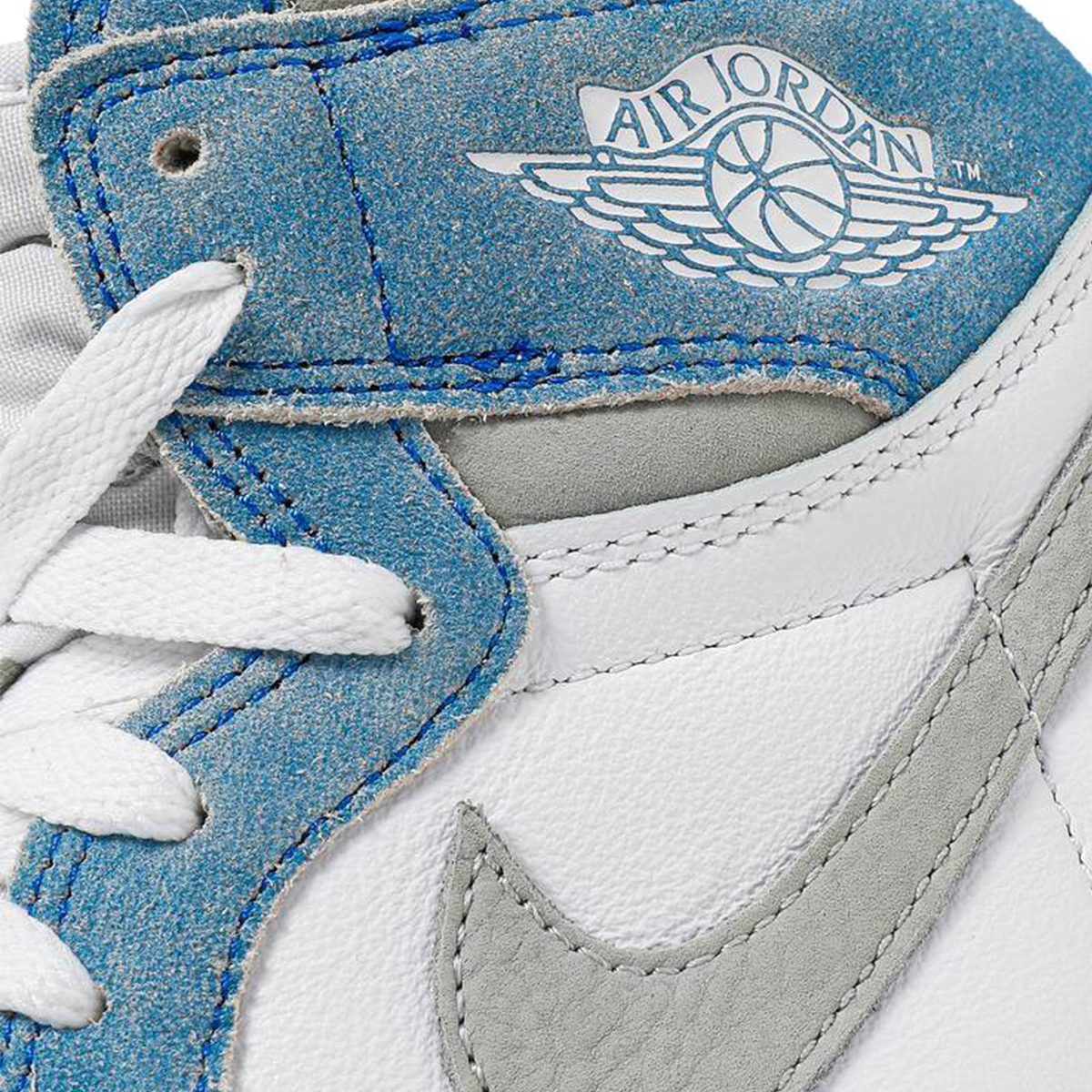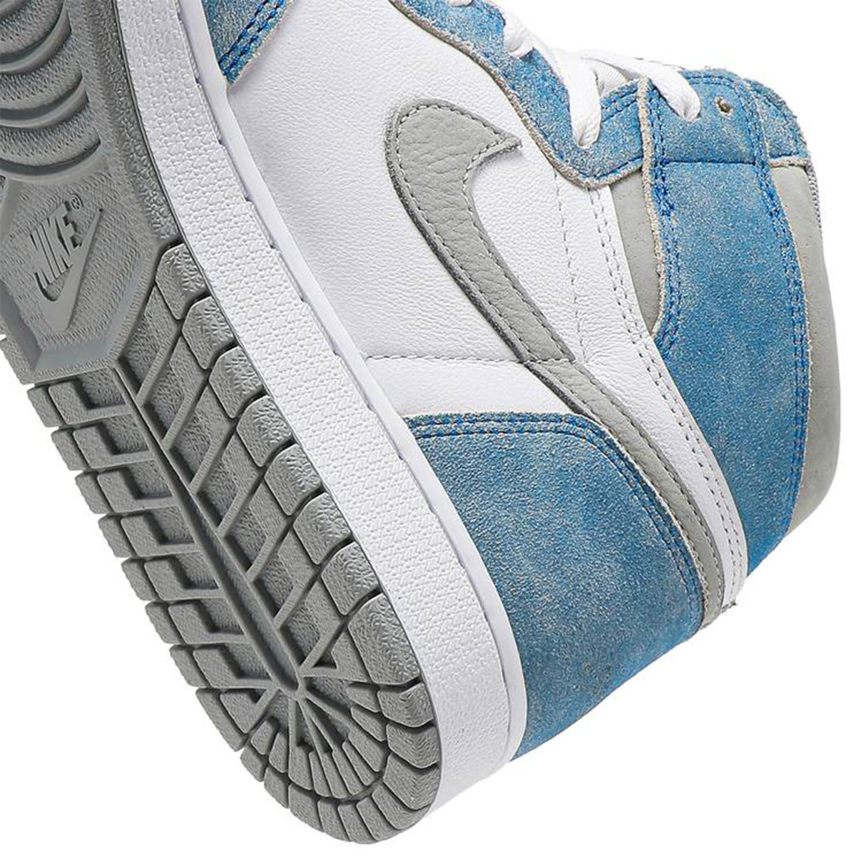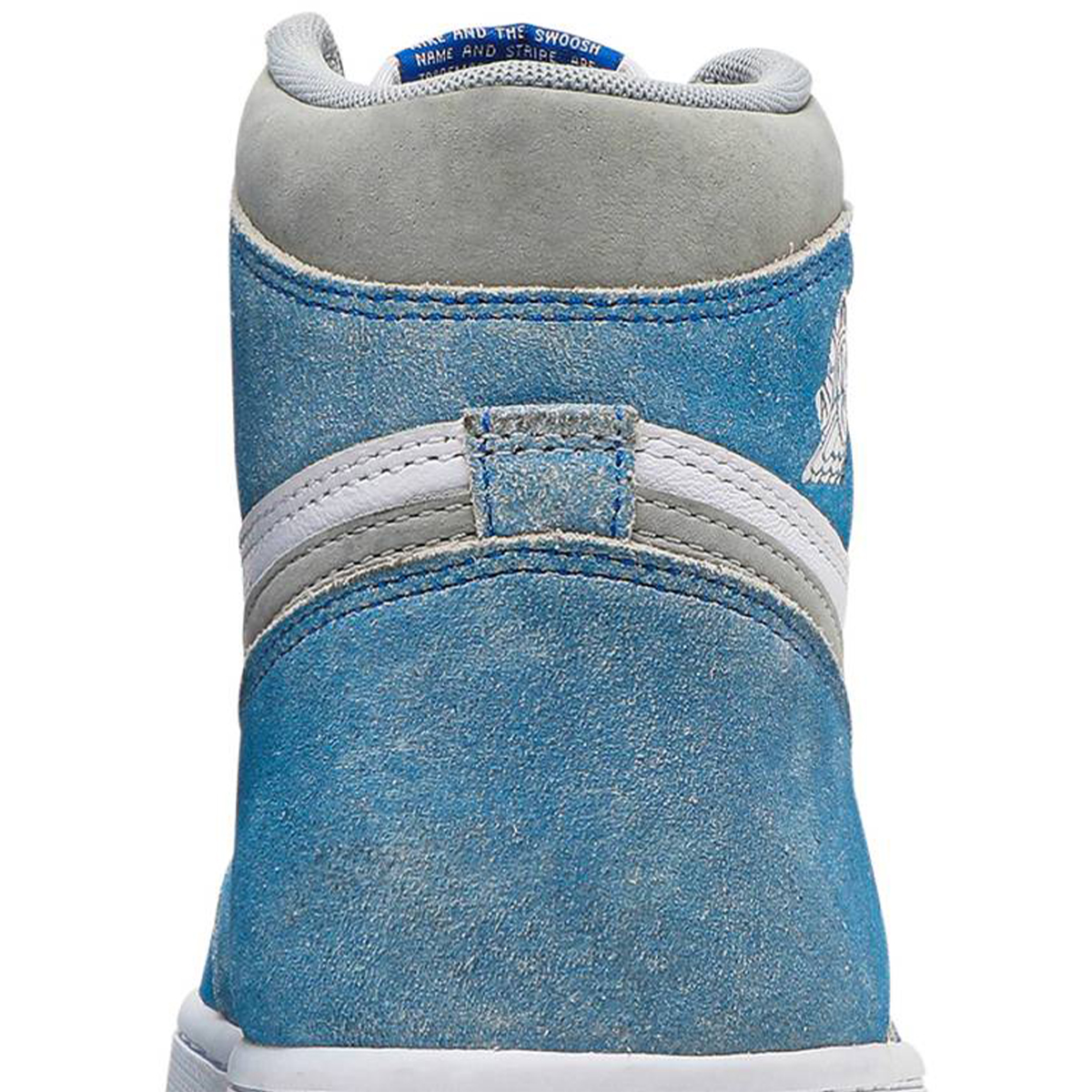 The Air Jordan 1 Retro High OG ‘Hyper Royal’ takes on a weathered aesthetic, highlighted by a white leather upper with faded blue suede overlays. Contrasting neutral grey hits land on the Swoosh and padded collar, adding to the sneaker’s understated palette. OG branding elements include a Jordan Wings logo on the lateral collar flap and a woven Nike tongue tag. The high-top is mounted on a standard AJ1 rubber cupsole, featuring encapsulated Nike Air cushioning in the heel.