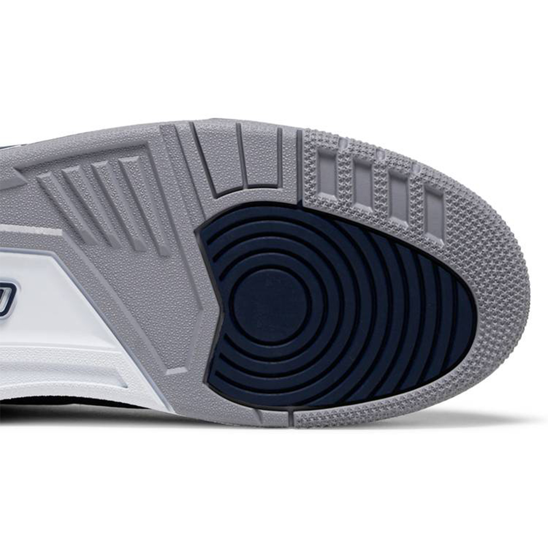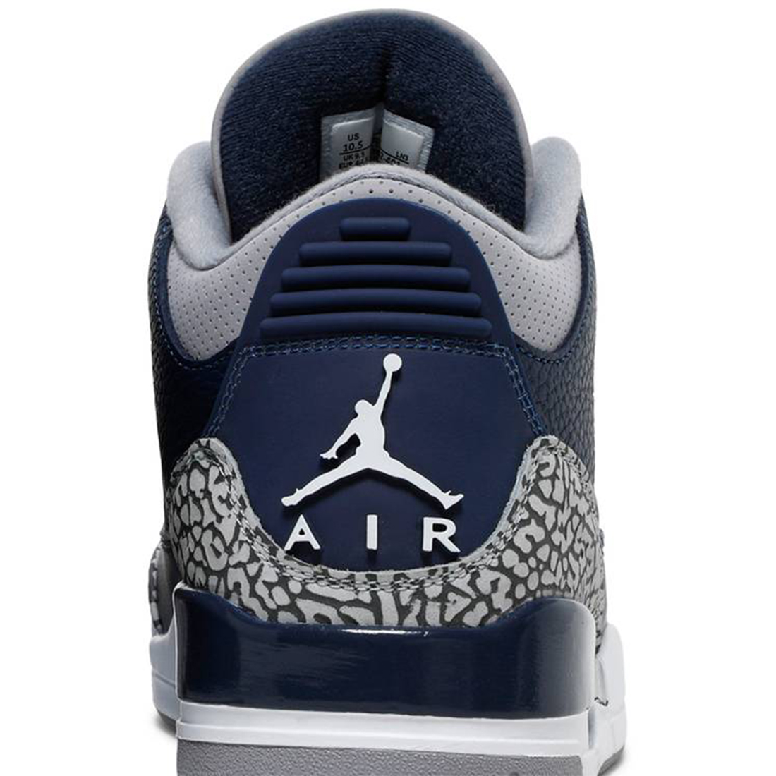 The Air Jordan 3 Retro ??Georgetown?? is clad in the signature colors of the Hoyas, the team that Michael Jordan victimized on the way to an NCAA national championship. The classic silhouette features a navy tumbled leather upper, reinforced with signature elephant print overlays at the toe and heel. Jumpman branding hits adorn the grey synthetic leather tongue and molded navy heel panel. Lightweight cushioning is provided by a polyurethane midsole enhanced with a visible Nike Air unit under the heel.