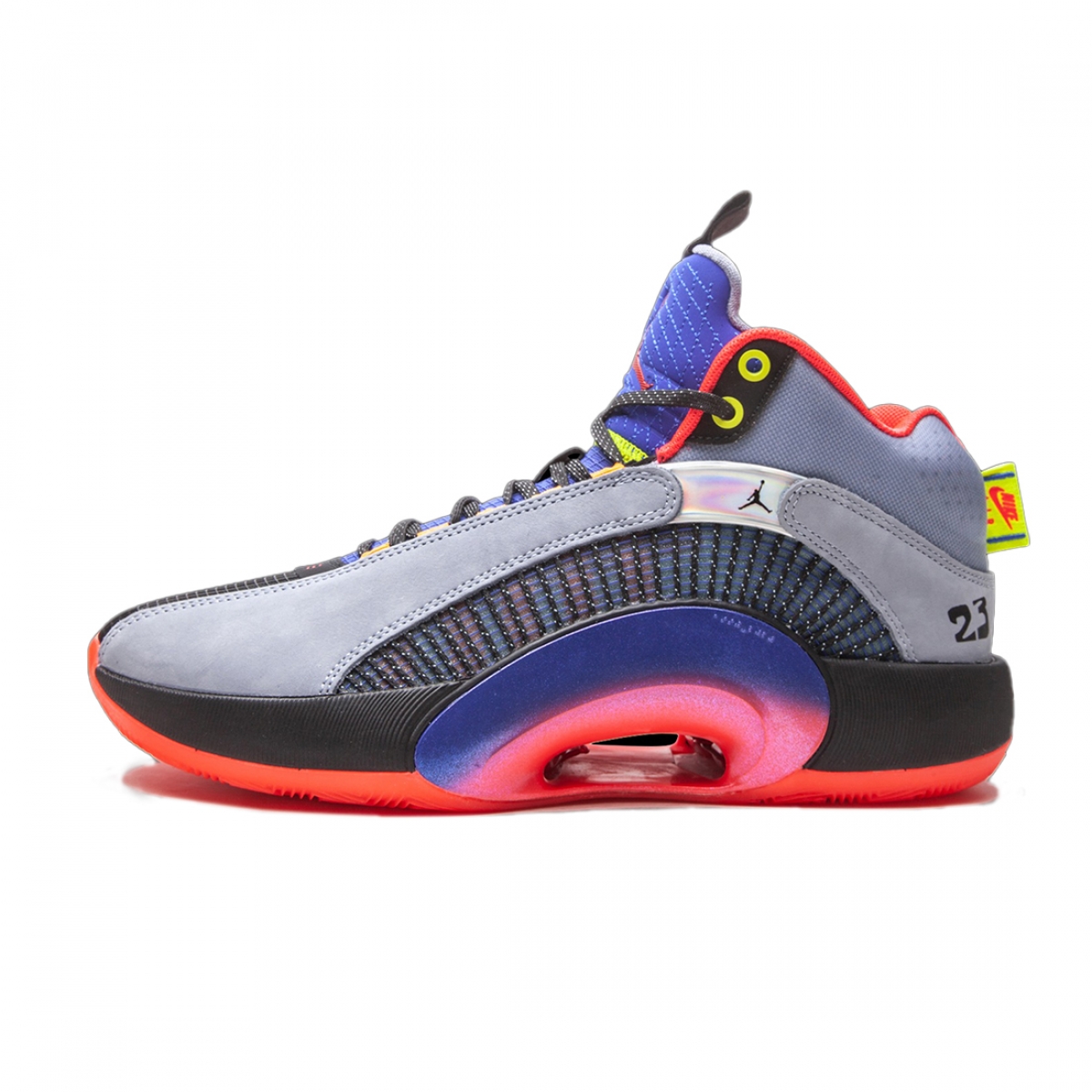 The Air Jordan 35 “Center of Gravity” is an October 2020 colorway of the performance basketball shoe that culls design cues from its Air Jordan heritage. Noticeably lighter in weight than its predecessor due to a modernized and updated Eclipse Plate, the Jordan 35 also features a new Flightwire system with an underlaid Kurim cage for improved on-court performance capabilities. Aesthetically, the “Center of Gravity” displays grey suede overlays above the multicolor, semi-translucent panels on either side. A small black Jumpman appears on the iridescent overlay on the collar and funky “23” detailing can be found on the lateral side in reference to the styling of the Player Exclusive Air Jordan 5 that Michael Jordan wore with the Chicago Bulls.