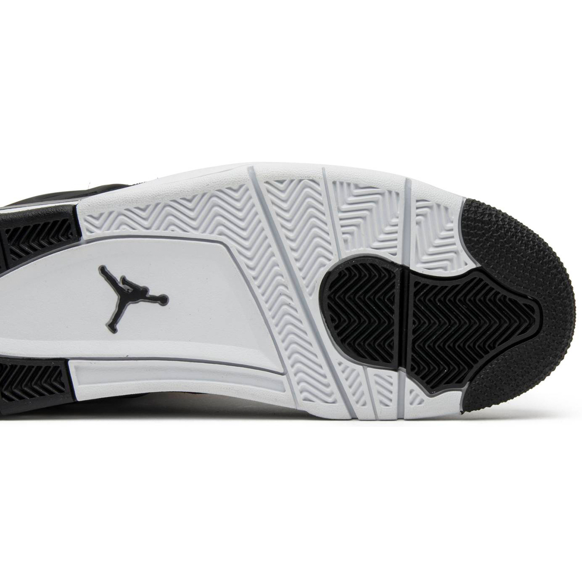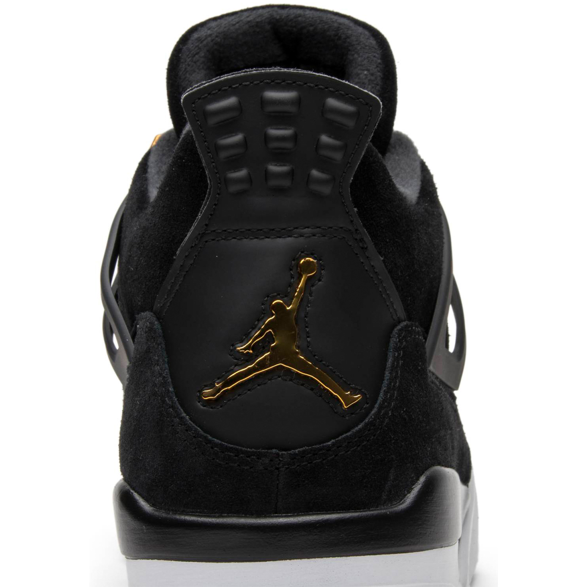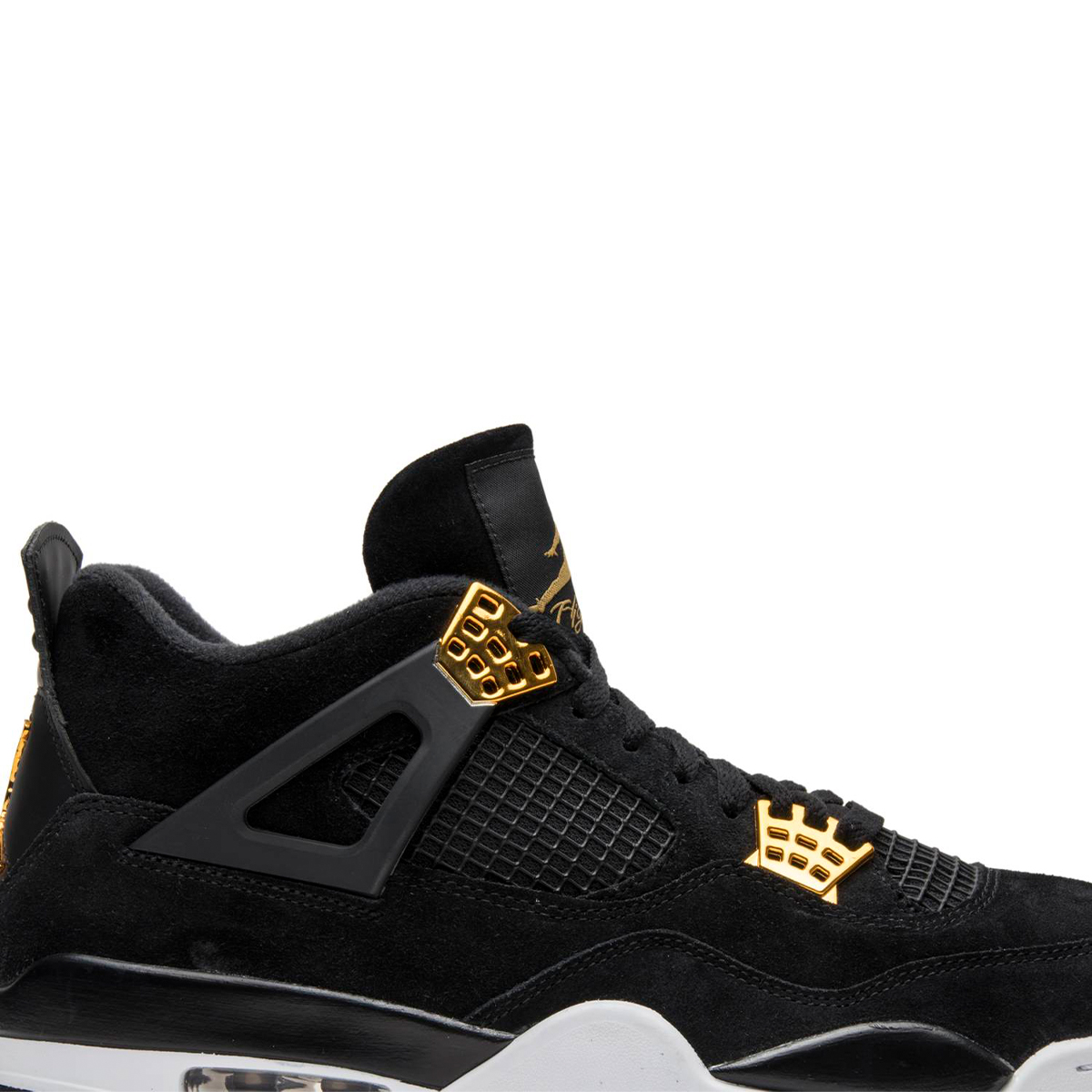 The Air Jordan 4 Retro ‘Royalty’ pairs a monochromatic black suede upper with contrasting metallic gold accents. They shine on the signature molded eyelets and a Jumpman icon on the synthetic leather heel panel. Additional Jumpman branding lands on the woven tongue tag and rubber outsole, featuring a traditional herringbone traction pattern for optimal grip. Lightweight cushioning is provided by a polyurethane midsole, enhanced with a visible Air sole unit under the heel.