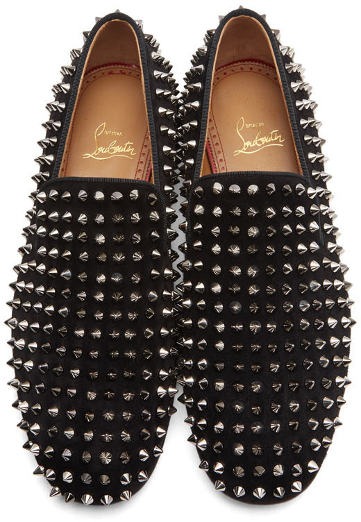 Calfskin suede loafers in black featuring studded detailing throughout. Round toe. Buffed leather and suede lining in brown. Tonal leather midsole. Signature red leather outsole. Silver-tone hardware.