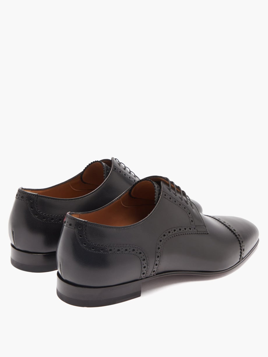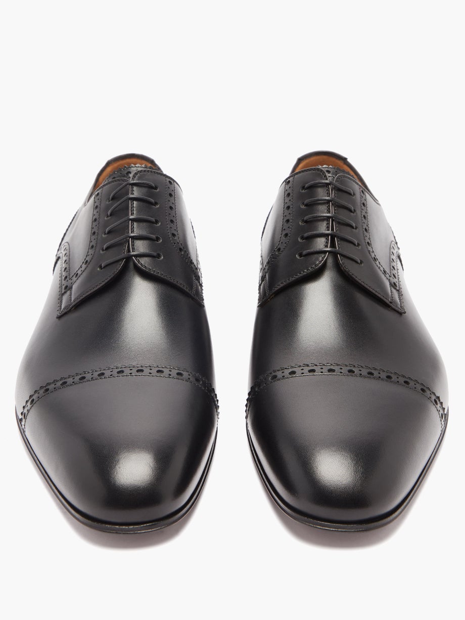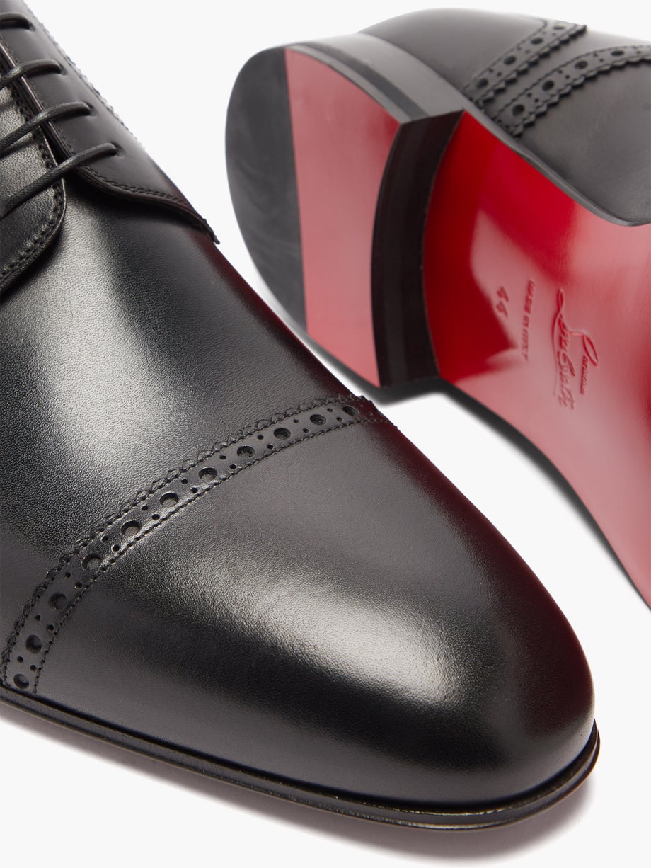 They’re crafted from smooth leather with traditional derby quarters and an almond toe adorned with scalloped edges and punctuations, then rest on a low-stacked heel and signature red lacquered-leather sole. Team them with structured suiting for a streamlined edit.