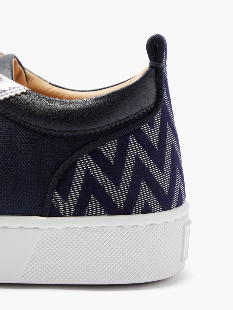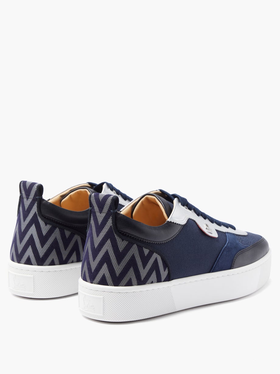 The low-top shape of Christian Louboutin’s navy Happyrui trainers is inspired by traditional tennis shoes. They’re crafted with a suede, mesh and leather-panelled upper, then feature a bold chevon-jacquard on the heel and CL-monogram hardware edging the laces. Style them as a refined finish to casual ensembles.