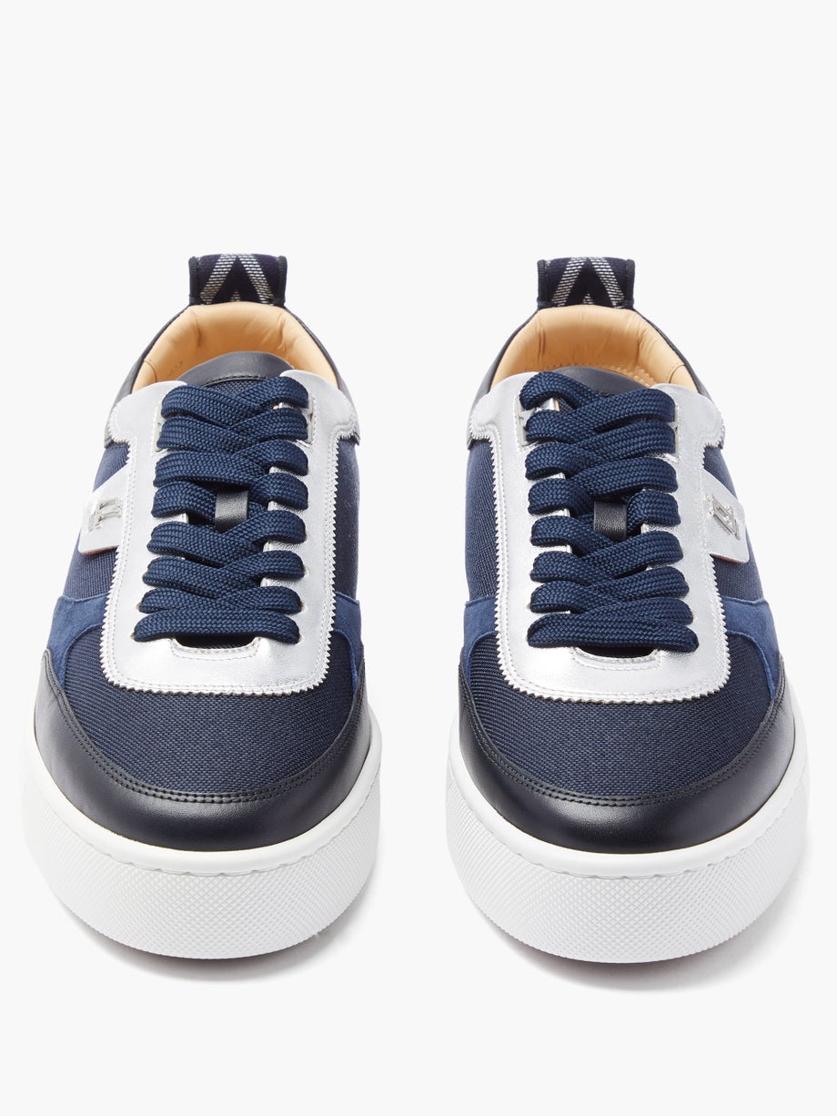 The Happyrui tennis-inspired sneaker is a flagship Maison Christian Louboutin design. It sits on a white rubber sole and combines textures for a style with daring. This low navy blue and silver shoe has contrasting finishes highlighted by a herringbone print on the back. It features the CL monogram on the facing.