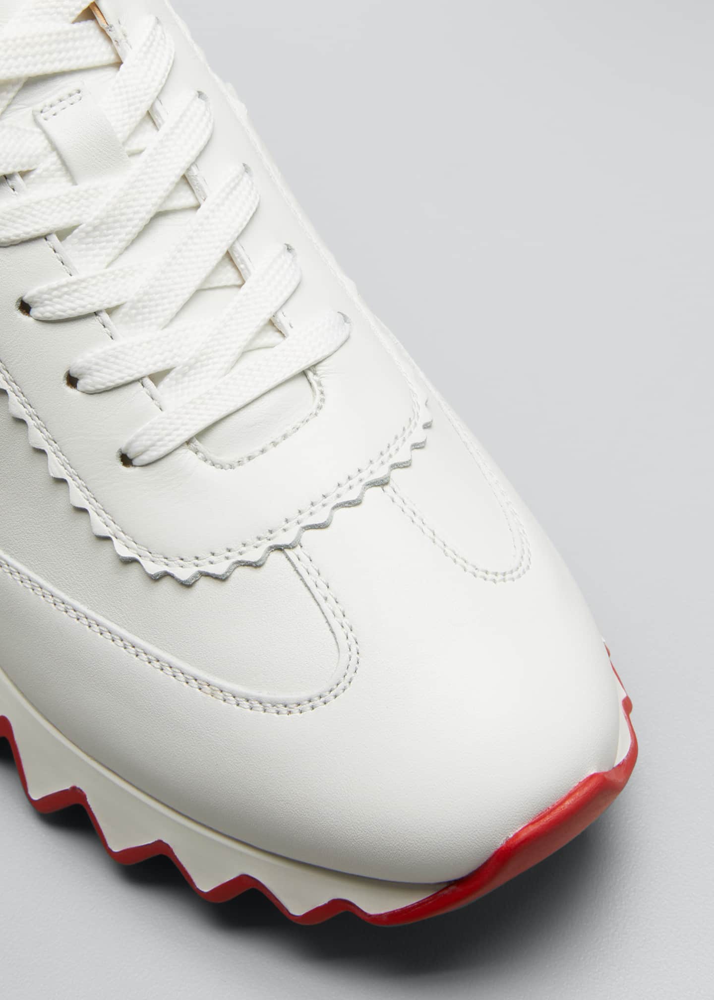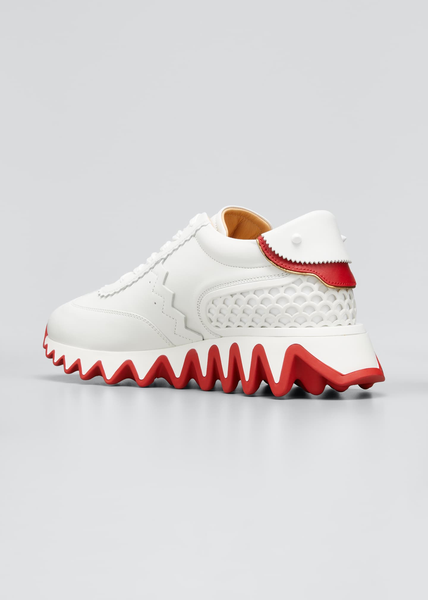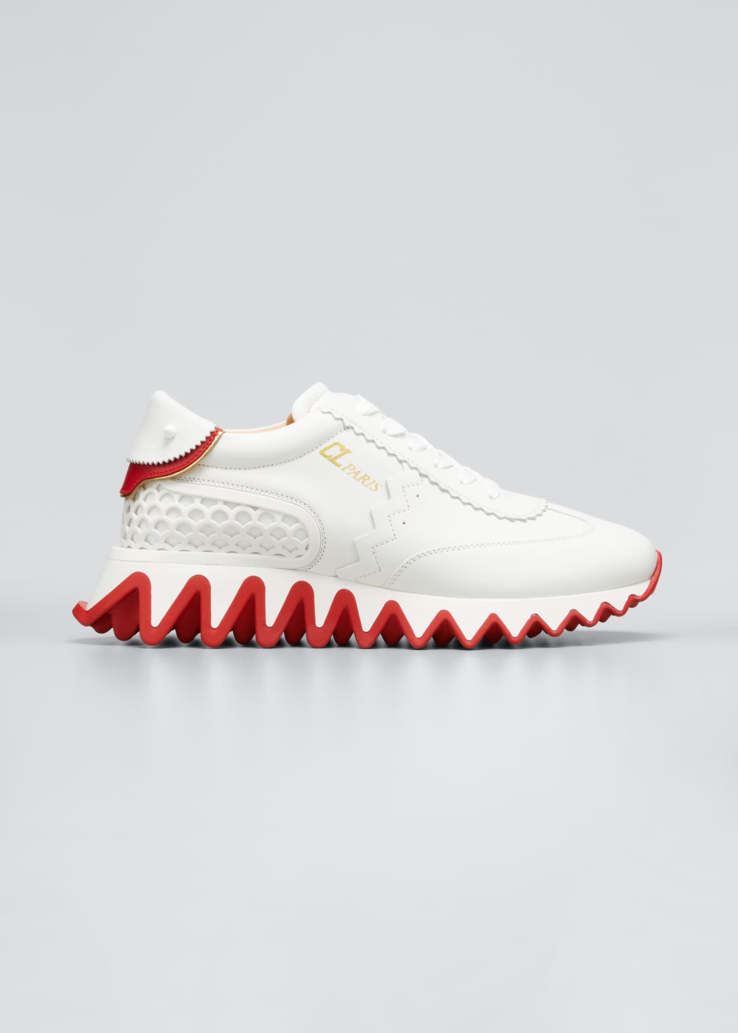 With its technical sole mimicking the giant snapping teeth of a shark outlined in red and fish scale detailing around the heel, the Loubishark is a beautiful blend of modern prowess and design. Signature details include a CL logo and glossy spikes at the back. This model in White combines calfskin leather, neoprene, suede and nappa laminate creating striking material contrasts.