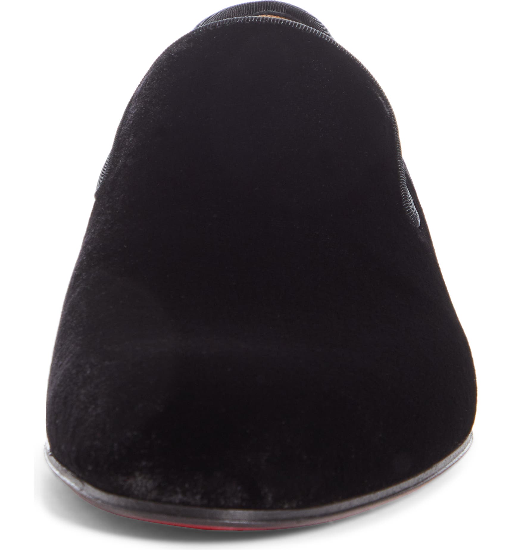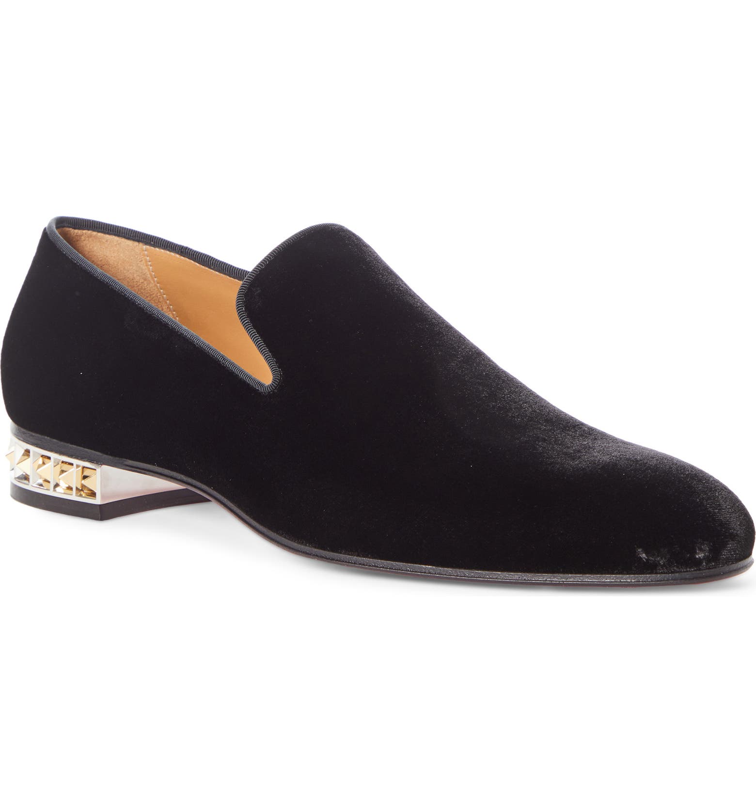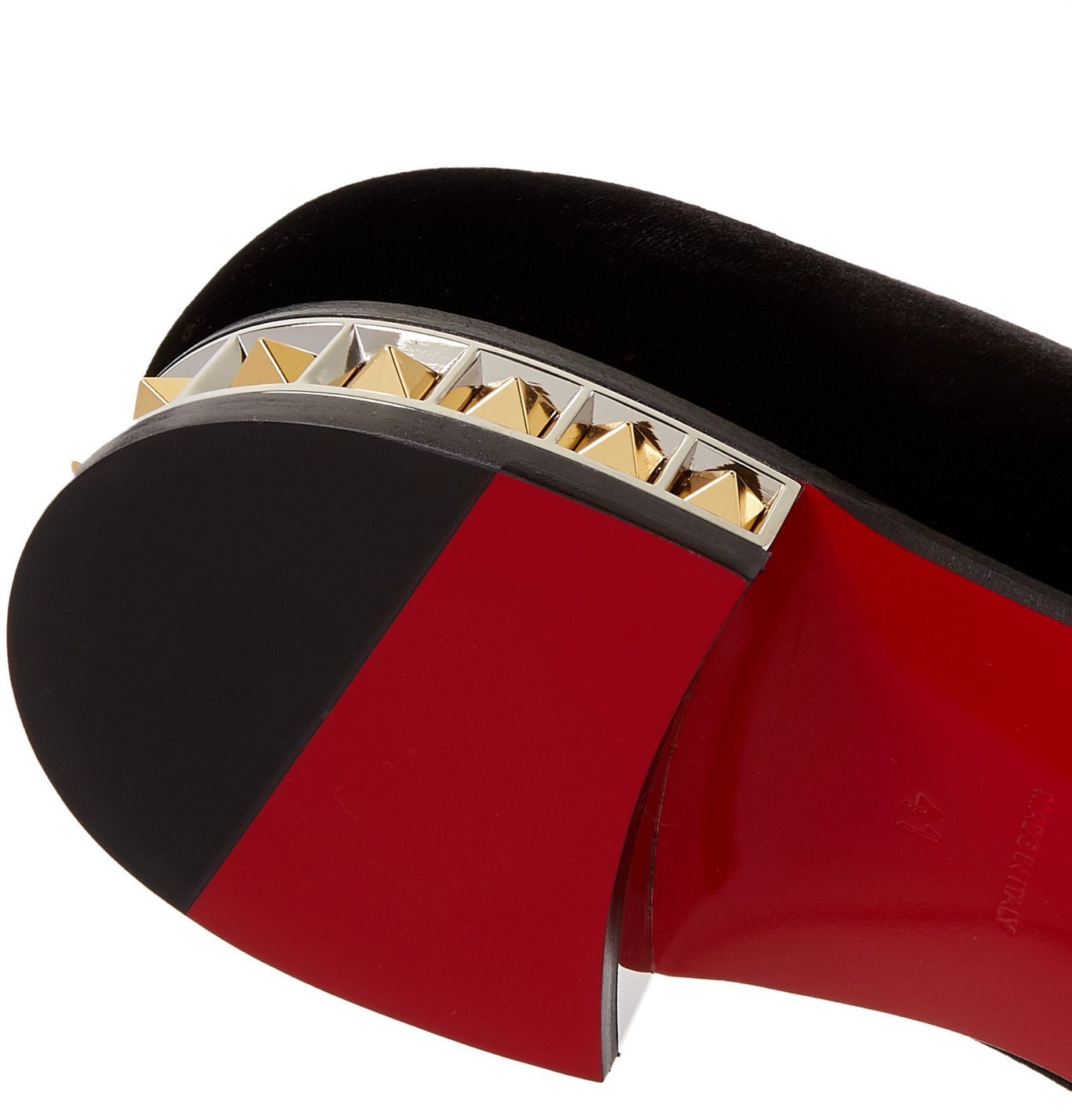 Christian Louboutin “Marpyramide” velvet loafer. Gold-tone spike inserts at heel. Round toe. Notched vamp. Grosgrain topline. Slip-on style. Made in Italy.