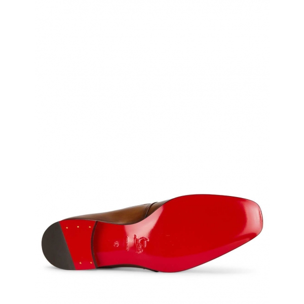 Christian Louboutin does dress shoes like no other and this seasons Mortimer Monk Shoes are no exception. They are in a brown leather upper with fading detailing and feature a thick strap at the front with double buckle fastenings. In the classic shape, they have a long almond toe and small black block heel. Branding them is their signature bright red leather sole with a small black rubber insert for added grip at the heel.