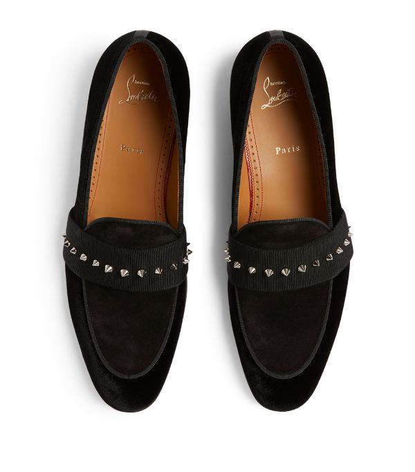 The slender and sleek profile of the Nit-Night moccasin has an alluring elegance. This black shoe with velvet finish sits on a thin sole and features grosgrain trims to give a sophisticated style. A tone-on-tone strap across the upper is adorned with a row of silver Maison Christian Louboutin signature spikes.