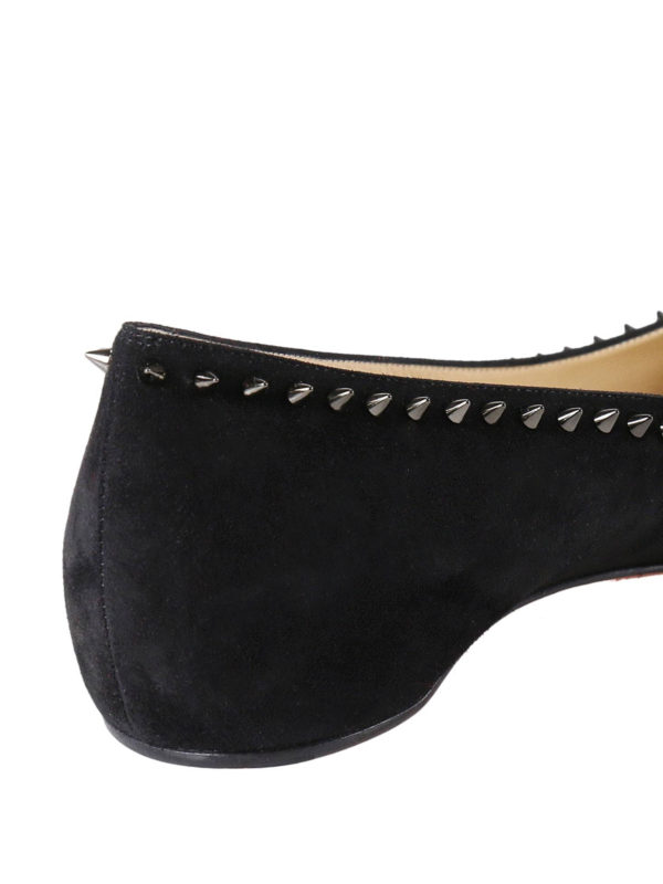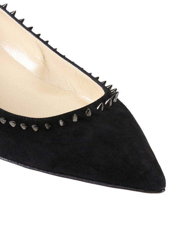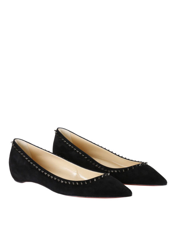 An ideal shoe for casual, elegant style, the Anjalina flat has pretty feminine lines with a pointed toe and a classic slender vamp. A summer essential, this model is crafted in ultra-soft veau velours in all-over black. A row of evenly spaced signature Maison Christian Louboutin gunmetal spikes outlines the vamp and heel. An audacious twist on a timeless flat.