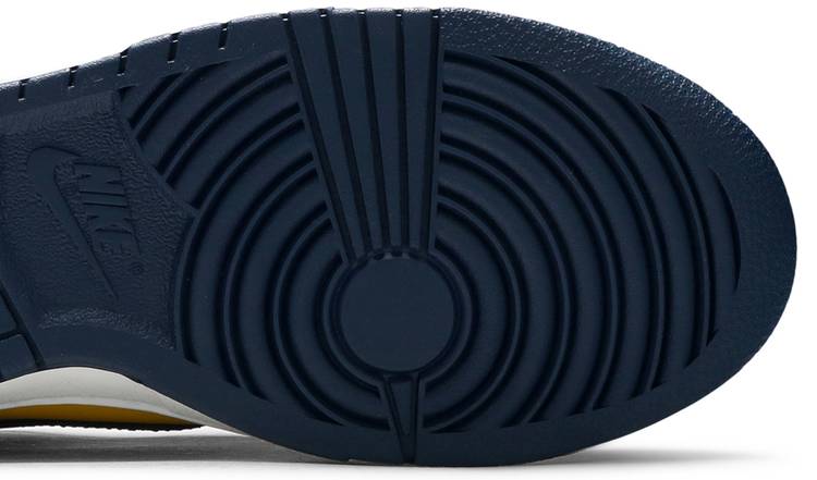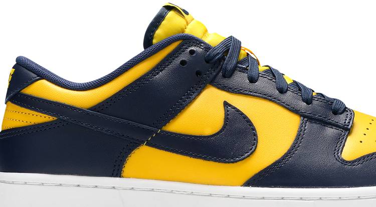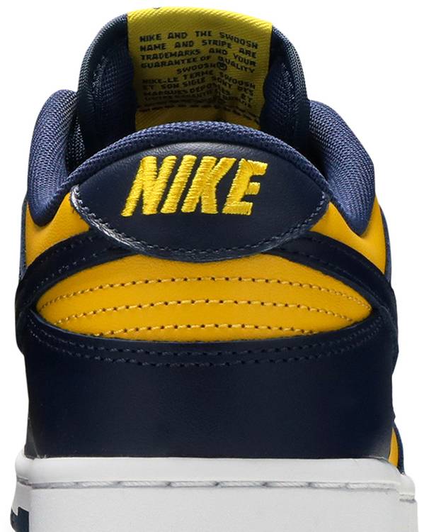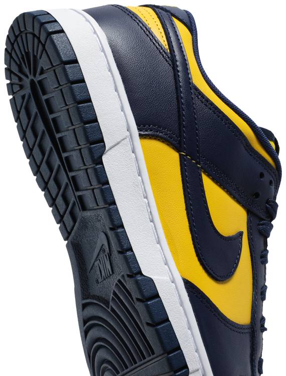 Contrasting Midnight Navy leather panels on the upper break up the look. A navy blue Swoosh graces either side of the shoe and yellow “Nike” embroidery is stitched onto the heel. Blue shoe laces are layered over the Varsity Maize nylon tongue. The Nike Dunk Low “Michigan” is an iconic colorway of the retro basketball, skateboarding, and lifestyle shoe.