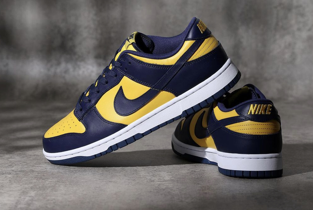 The Nike Dunk Low “Michigan” is the low-top version of an original Dunk colorway worn by the Michigan Wolverines basketball team in 1985. The “Michigan” first appeared in 1985’s “Be True to Your School” collection of college basketball inspired Dunks. The Varsity Maize and Midnight Navy design was brought back in September 2020 on the Dunk High. This low-top silhouette of the retro basketball model follows the same style cadence as the original and high-top edition. Varsity Maize leather appears on the perforated toe and on the mid-panel, collar, and heel.