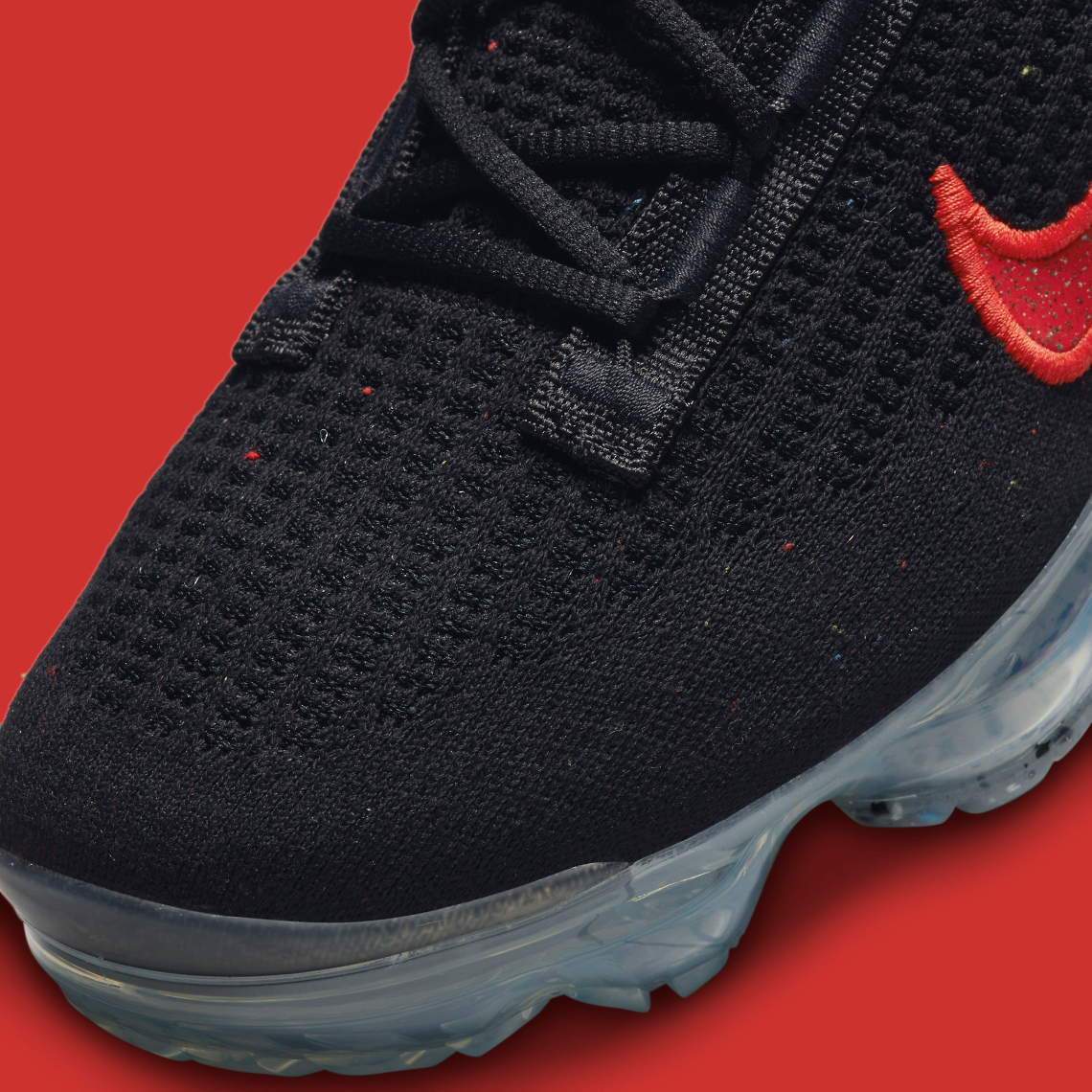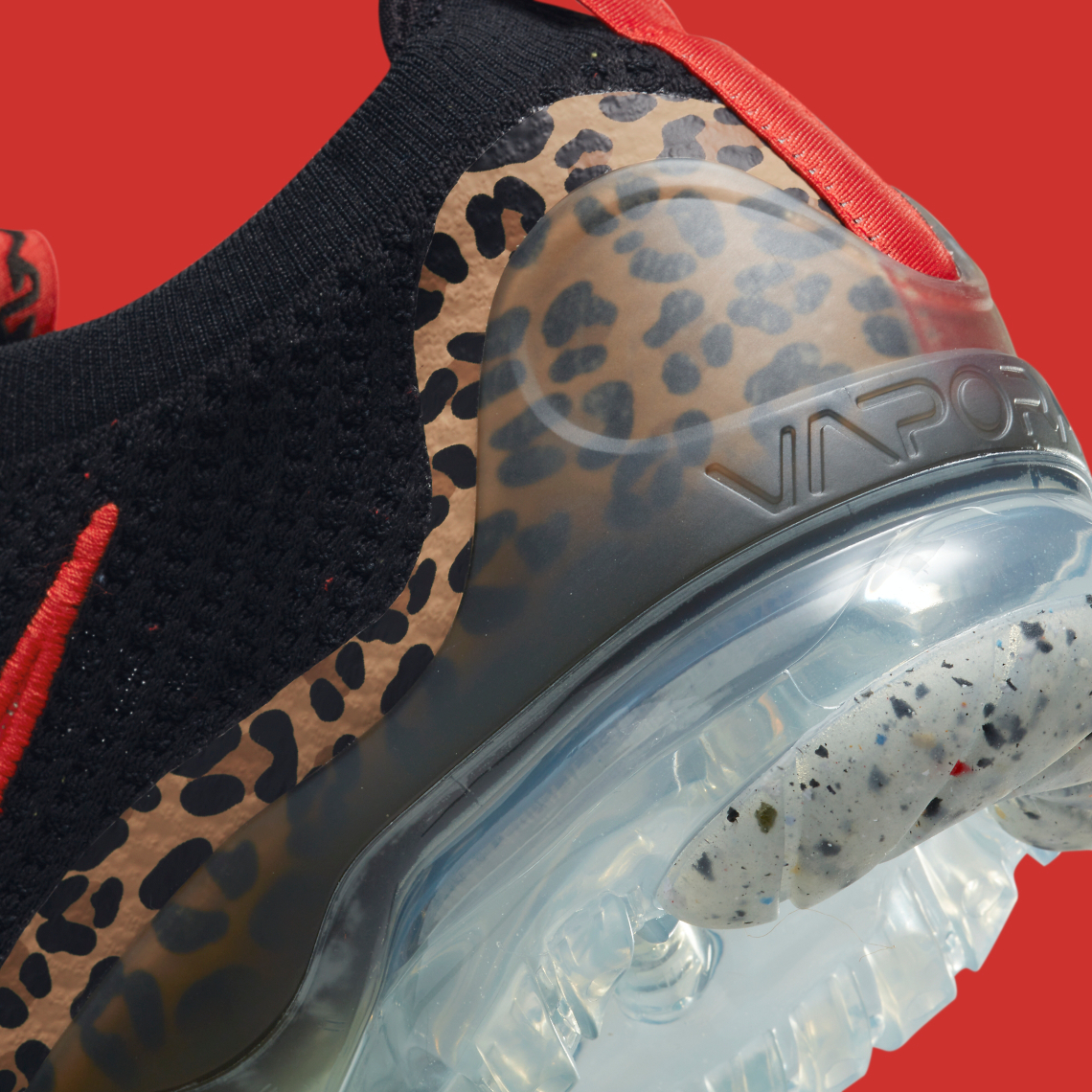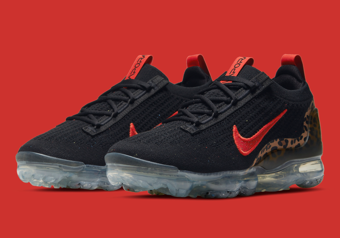 The lifestyle-focused silhouette appeared in a classic mix of “Black” and crimson tones, complete with leopard print detailing around the heel. The shoes haven’t been confirmed as a women’s-exclusive just yet, but if some recently-seen Air Max offerings with similar patterns are indicative of anything, it’s that the Swoosh tends to employ the wildcat-inspired graphic on footwear for the ladies. Pull tabs on the top of the tongue and at the heel also opt for the profile swooshes’ vibrant red tone, while VaporMax units underfoot forgo any of the upper’s hues in favor of a clear finish. Up-cycled Nike Grind material at high-wear zones, however, introduces some medley of tones to the outsole.