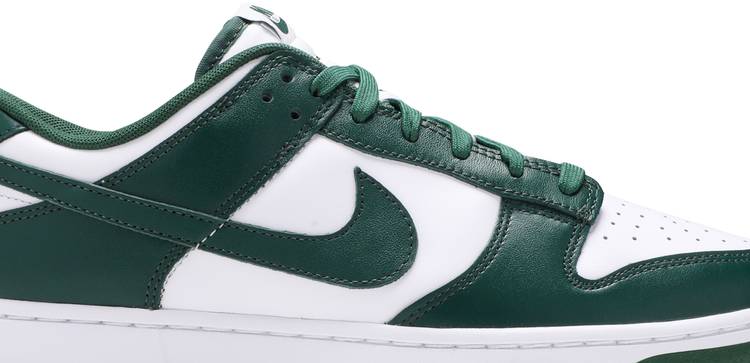 The Dunk Low ‘Team Green’ is a low-top iteration of a 2020 Dunk in Michigan State colors. Built with leather, the shoe’s upper appears in a school mix of white and Team