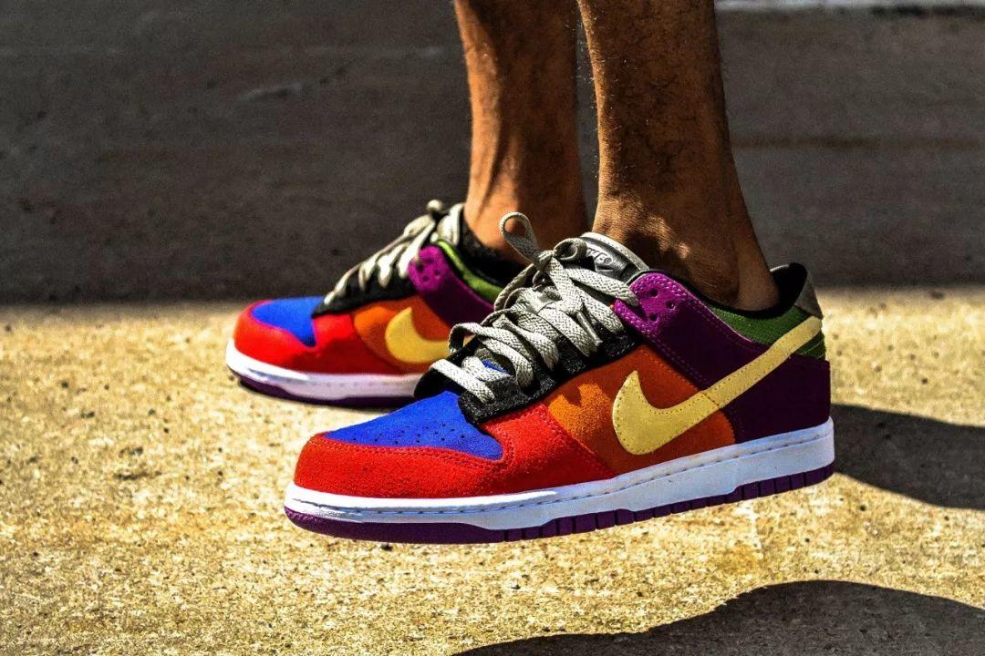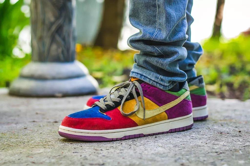 The Viotech 2019 edition of Nike Dunk Low SP is decked out in many suede panels. Besides, the purple, orange, red and many other accents clash with each other that are bound to turn heads. Other details include cream swoosh and light grey accents.