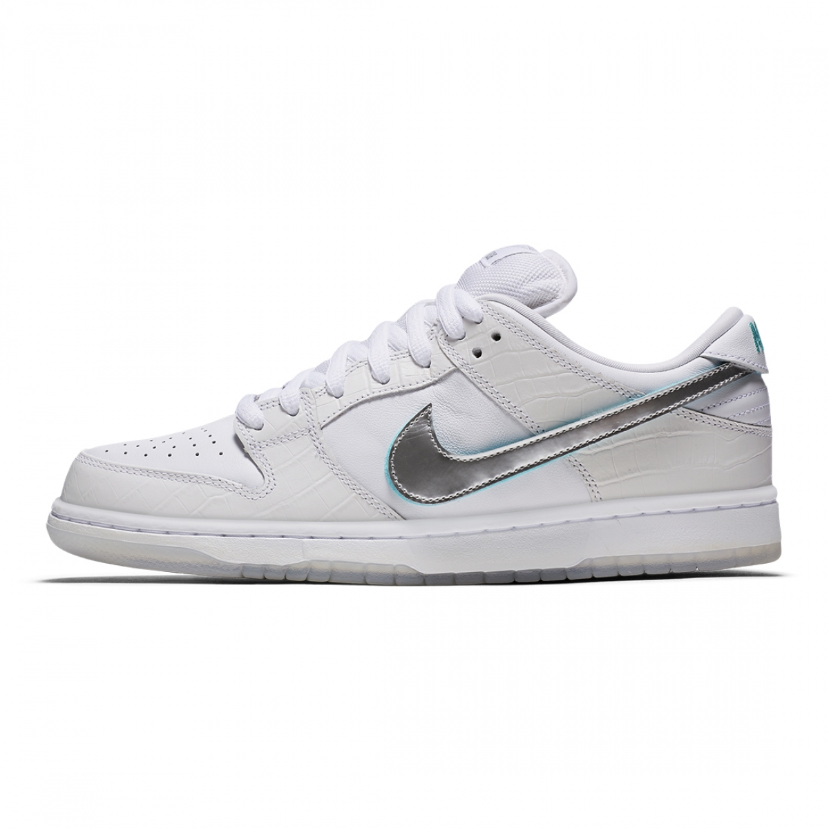 Tershay’s latest teaser shows a white Nike SB Dunk Low boasting overlays with the croc-like texture found on the “Tiffany” Dunks. Unique to this iteration is a Velcro Swoosh, which reveals a “Tiffany” blue shade underneath. Further details include metal Diamond-branded aglets and what appears to be an icy translucent sole.