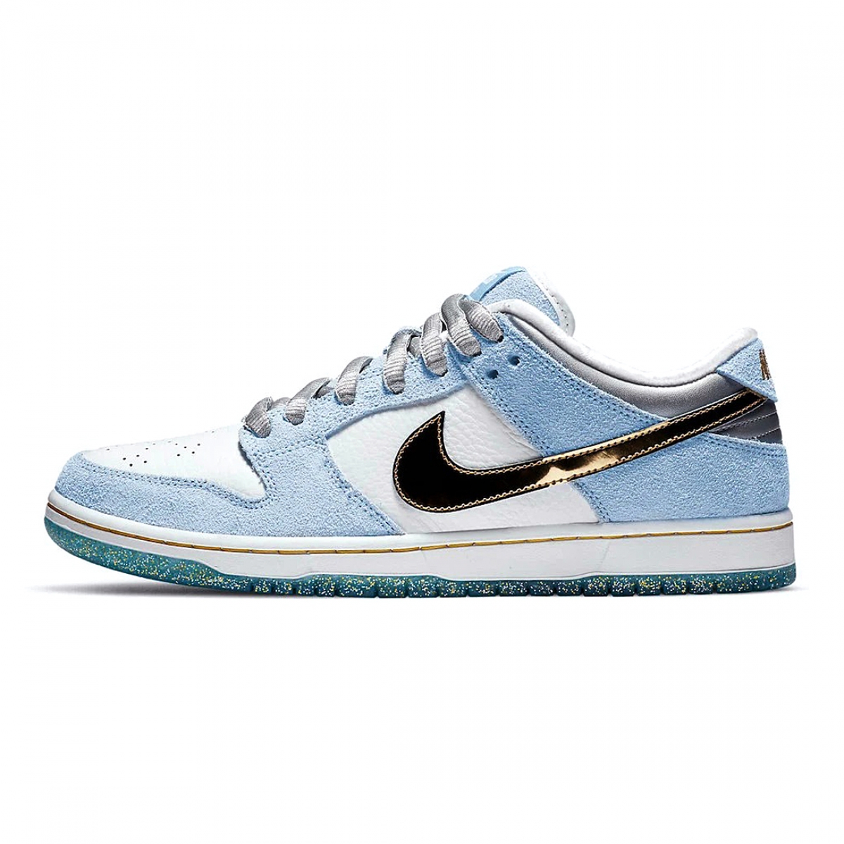The Sean Cliver x Nike SB Dunk Low “Holiday Special” is a Holiday 2020 collaboration between StrangeLove Skateboards and Nike SB that’ll add Christmas spirit to your sneaker collection. The “Holiday Special” is the second SB Dunk created in tandem by StrangeLove and Nike SB in 2020, and follows 2012’s “Krampus” Dunk High colorway by Cliver. Here, the upper is outfitted with references to winter, starting with the snowflake inspired supple Ice Blue suede overlays on the forefoot, eyelets, collar, and heel. The theme continues with crisp white leather on the perforated toe and mid-panel. A flashy Metallic Gold leather Swoosh breaks up the look on either side of the shoe and silver lace sits on top a padded light blue suede tongue. Embroidered gold “Nike” detailing is located on the heel. The insole of the right shoe features co-branding in the form of Sean Cliver’s signature and gold Nike SB detailing. The left shoe’s insole displays elves making toys. A speckled icy blue outsole adds to the overall festive wintry theme.