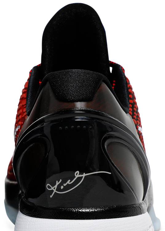 Like the “OG” look, bright red “scales” appear in an all-over pattern on the upper, save for the black heel counter sporting Bryant’s signature.Black undertones can be picked up on various points in the design of the upper, particularly near the forefoot and heel. A white painted Swoosh graces either side.